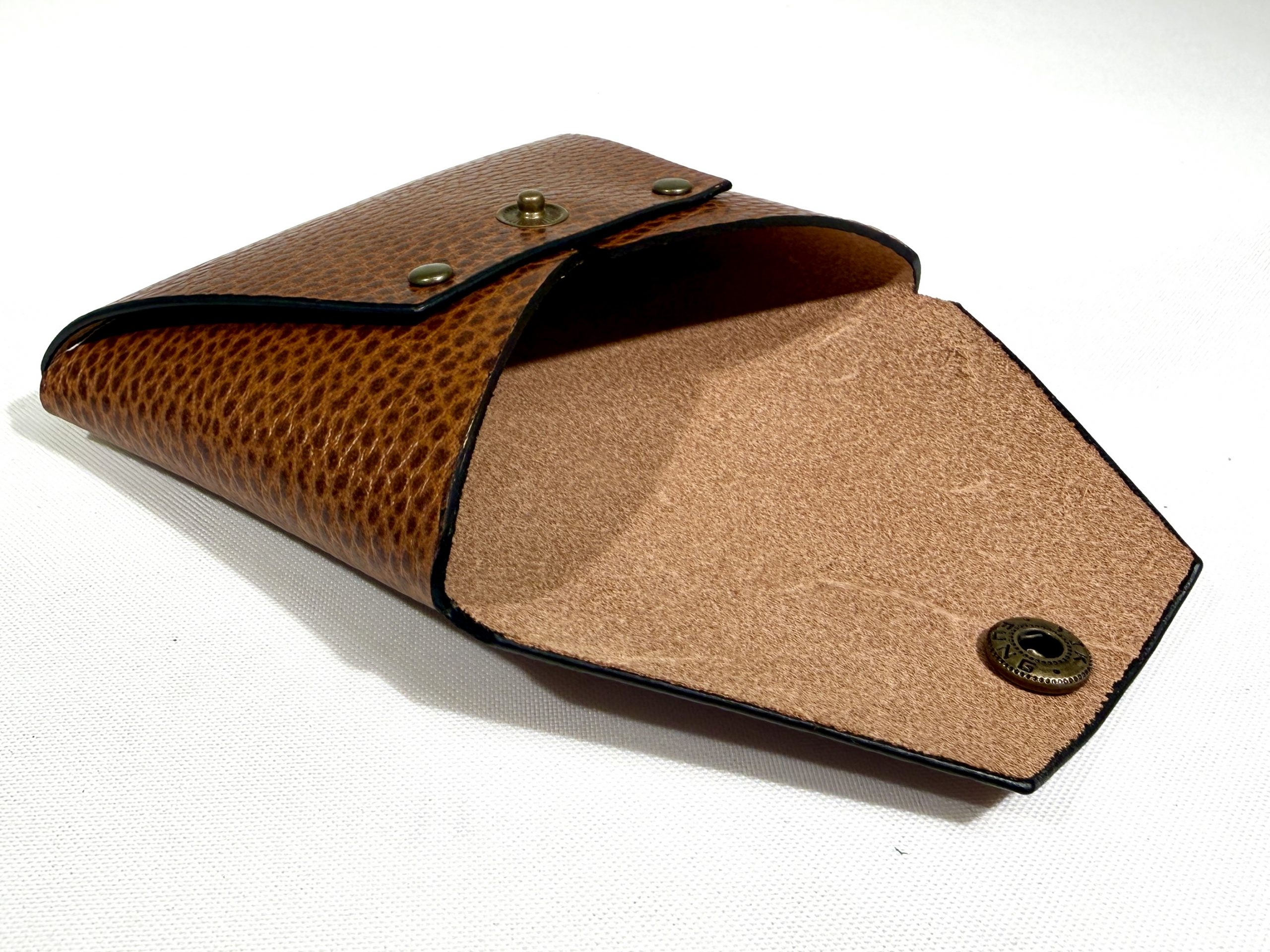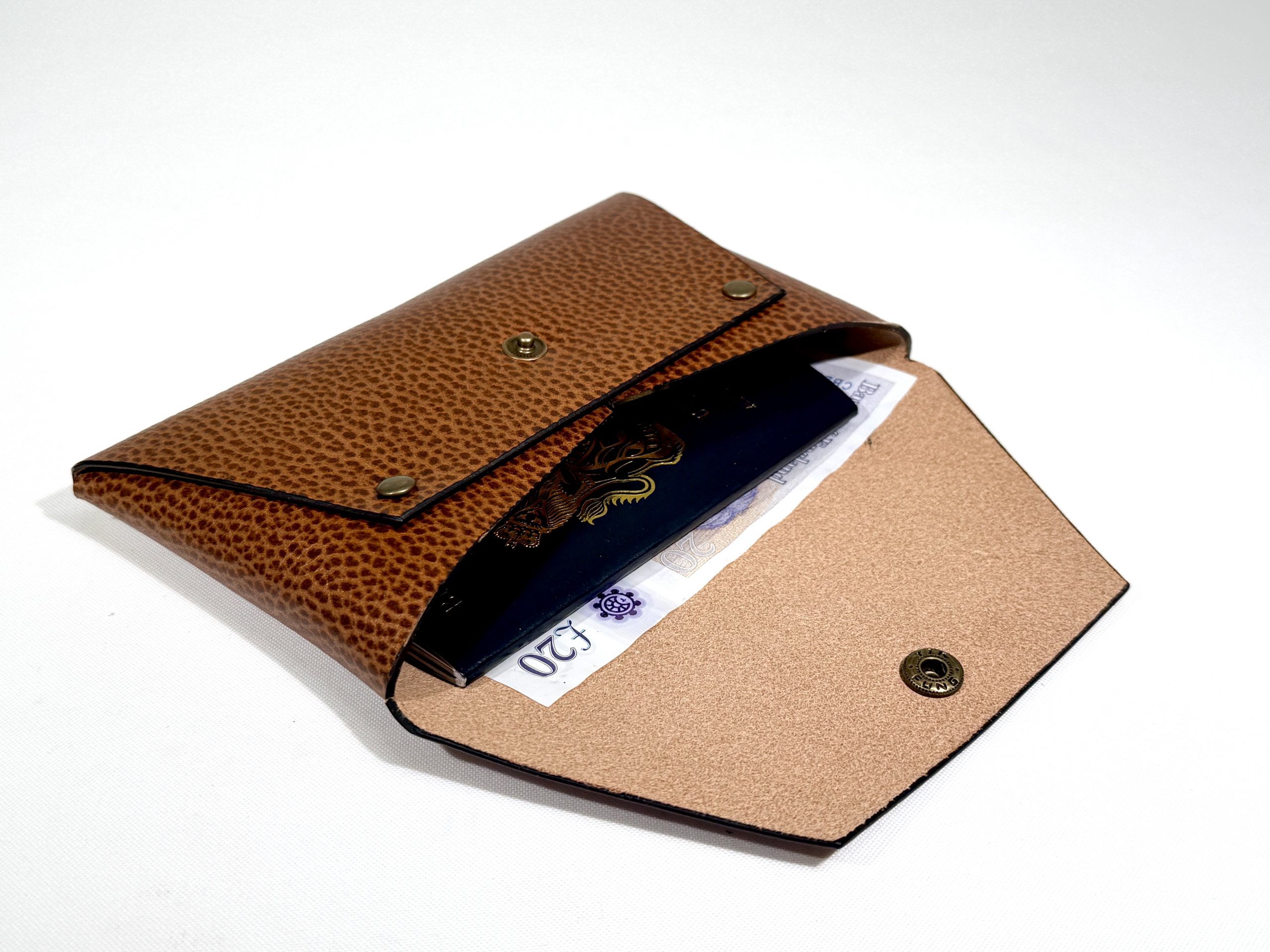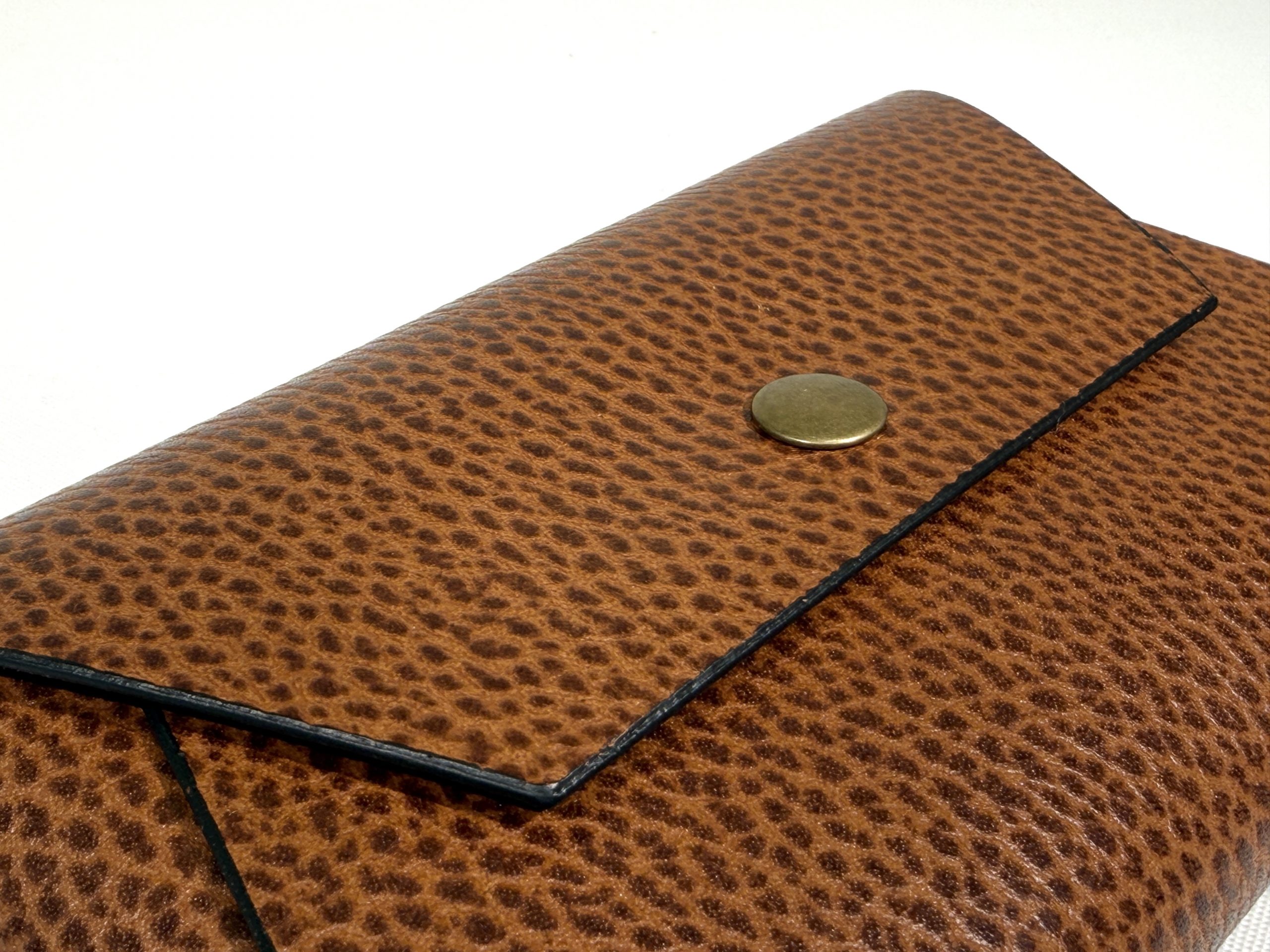 Classic envelope design leather pouch. Comes in 2 sizes, the small size can keep change, bank notes (folded), credit card/membership card while the large size can be more versatile as it can keep: cash, change, cosmetics even passport for your travel. It has popper snap closure to completely close the bag and keep everything inside.